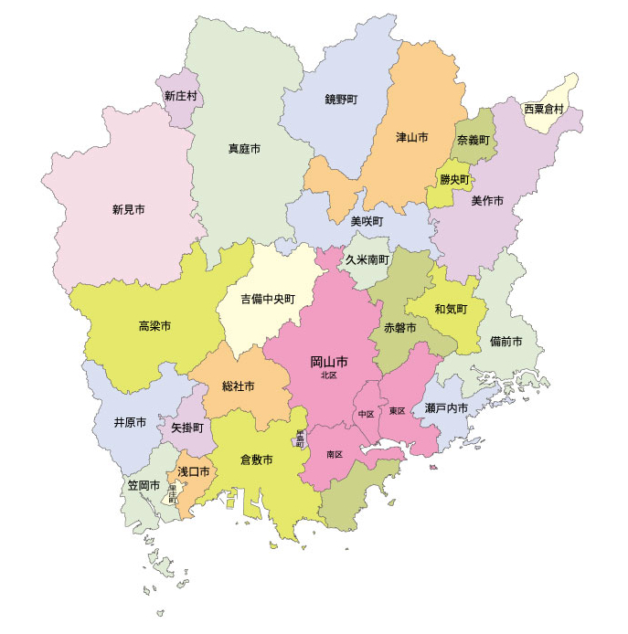 岡山市|倉敷市|岡山市北区|岡山市南区|岡山市中区|津山市|岡山市東区|総社市|玉野市|笠岡市|真庭市|井原市|赤磐市|瀬戸内市|備前市|浅口市|高梁市|新見市|美作市|美咲町|和気町|矢掛町|鏡野町|吉備中央町|早島町|勝央町|里庄町|奈義町|久米南町|西粟倉村など。